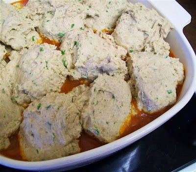 5.  Take casserole out of oven and drop heaped tablespoonfuls of dough onto top (using a tablespoon and butter knife), cover with lid (or loosely with foil), making sure there's room for dumplings to rise, and return to oven.